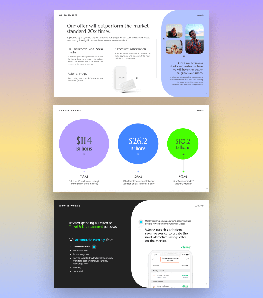 Product visuals, UI mockups, and iconography were integrated to support the story without overwhelming it. Every visual element had a clear purpose: reinforcing credibility, simplifying complexity, and helping investors quickly understand how WireBee works and how it makes money.
